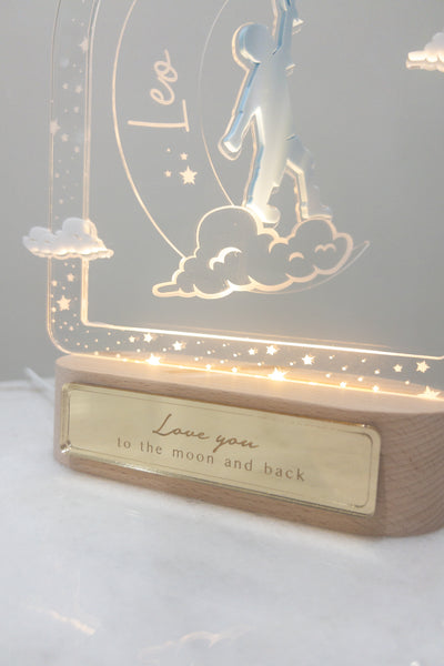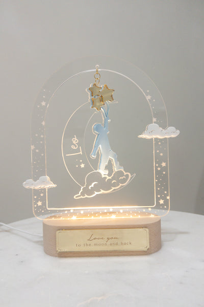 Featuring a little boy walking on clouds and a crescent moon, holding balloon stars - crafted from 3mm acrylic. The moon hangs from an arch border of clear acrylic, etched with stars and the option to add the wording ‘Sweet Dreams’ along the top of the arch. The stars and wording glow when the led light is turned on. The boy and clouds are illuminated creating a magical effect. There is also an option to add a mirrored acrylic plaque to the base for engraving - making it a beautiful gift or keepsake.