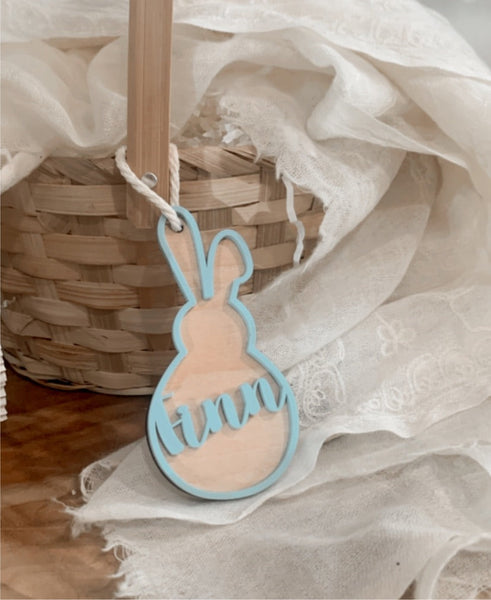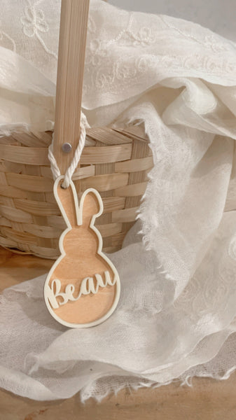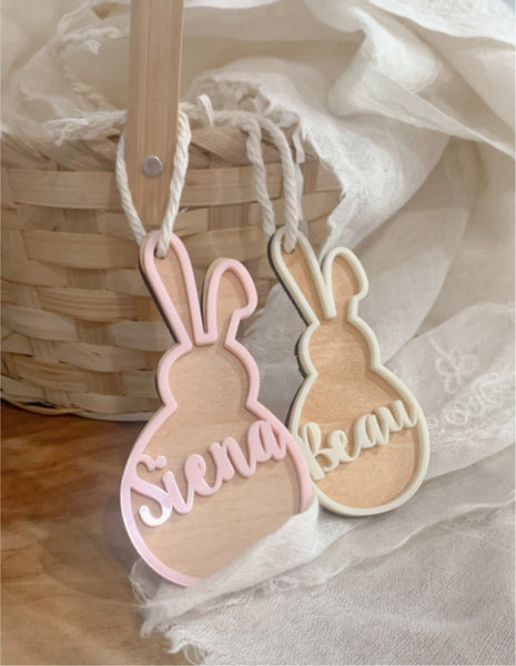 Easter basket tag ornament - Personalised with your children’s names. Crafted from 4mm plywood, and acrylic, measuring roughly 10cm high.