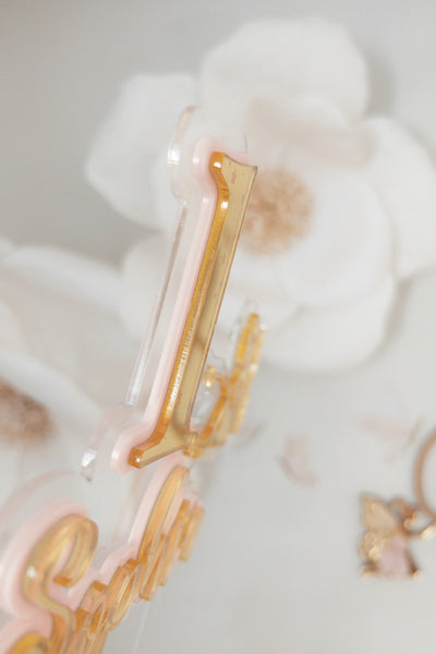 This product is laser carved/cut from a 3mm multi layered acrylic, and gold non-toxic painted plywood. 3 layered acrylic topper.