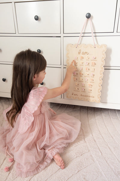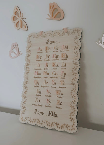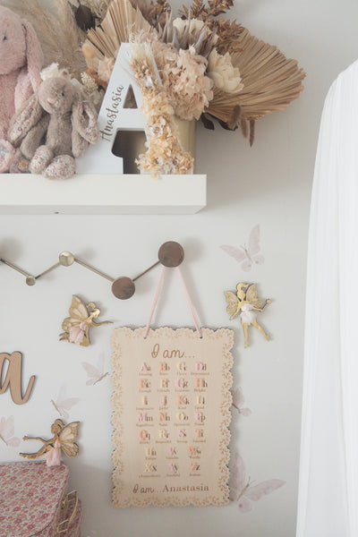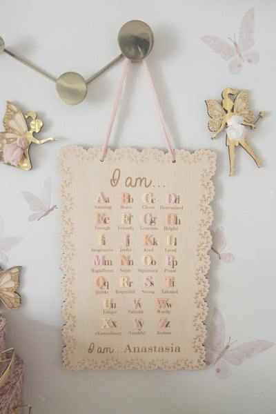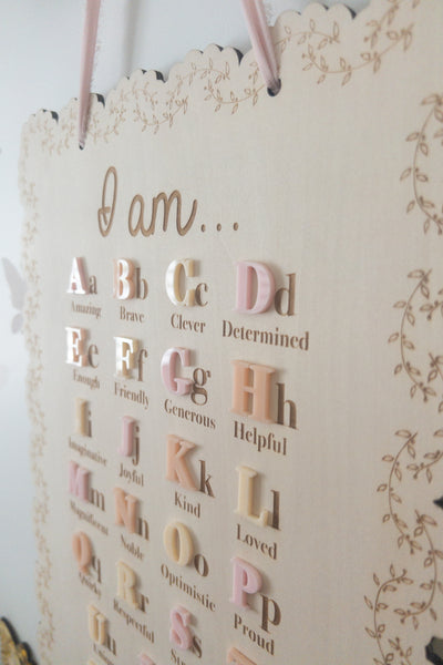 Daily affirmations are a lovely way to encourage your little ones to love themselves for who they are! Let them learn all the amazing things about themselves, while they learn their alphabet! Comes with a chiffon ribbon on top that makes it easy for hanging.