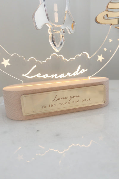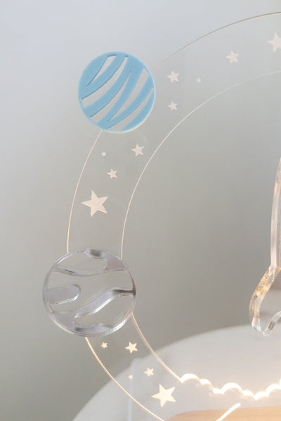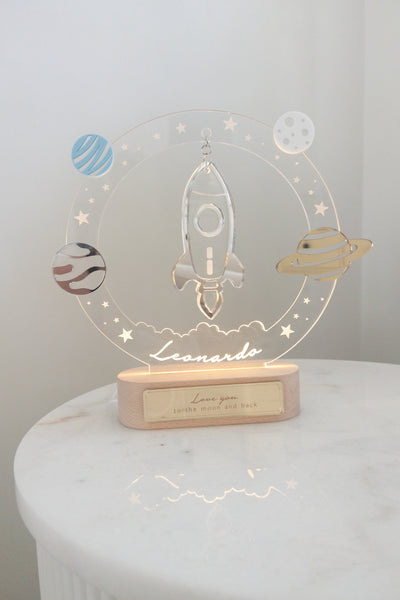 The rocket is outlined in mirrored acrylic. Their name etched into the bottom of the clear acrylic piece, illuminated when the LED is turned on. Colours are as shown, but if you would like specific planet colours please contact us directly on Instagram @designsociety_au and we are happy to accomodate depending on stock.