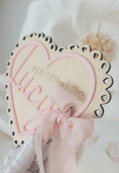 Celebrate the arrival of your little one with our Sweetheart Scalloped heart Baby Announcement Sign — a beautiful keepsake designed to capture life’s most precious moment.